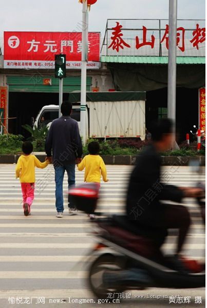 小女孩过马路时,一辆摩托车呼啸而过,实在触目惊心。